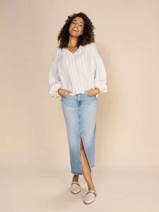 This fashionable denim skirt is elegantly tailored for a long fit. With its front slit, pockets, and a leather badge