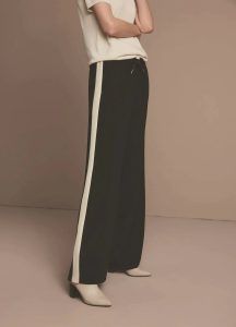 Relaxed wide-leg trousers with an elasticised waistband and drawstring closure. The supple fabric has a contrasting placket across the side