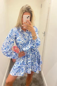Introducing our vibrant blue printed mini skater dress, a playful and feminine addition to your wardrobe. The striking blue hue