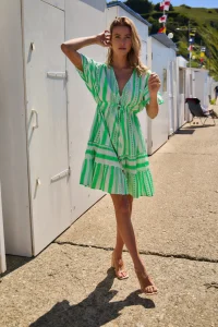 We love this mid length dress, V-neck with tightening at the waist. Perfect for your summer suitcase or that occasional
