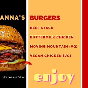 Choose from Annas delicious burgers: Beef stack Buttermilk chicken Moving mountain Vegan Chicken
